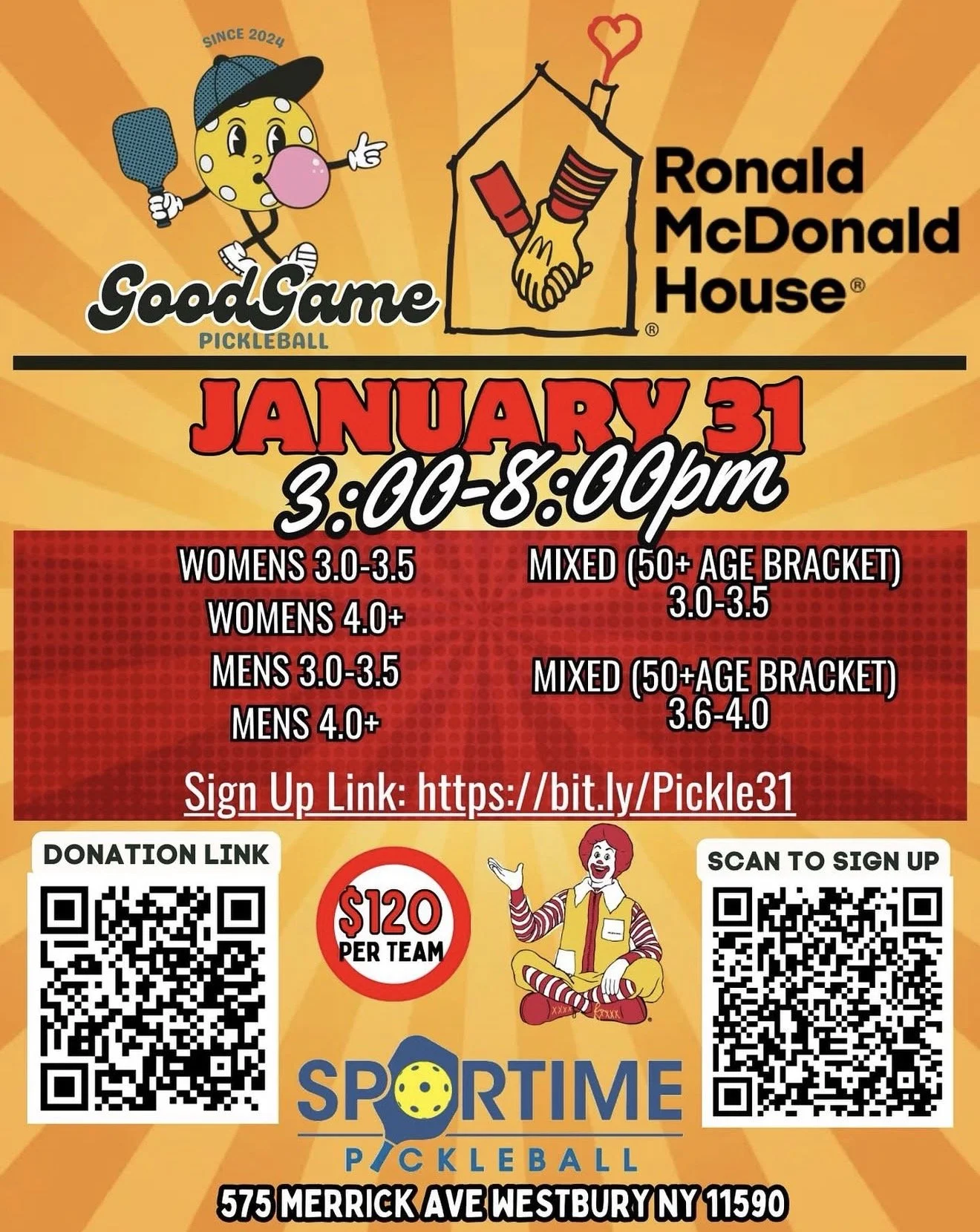 GoodGame Pickleball is proud to partner up and host its first ever tournament at Sportime Westbury on January 31st in partnership with the Ronald McDonald House Charities (RMHC). This event will be our Inaugural Awareness Tournament as donations will be held to benefit the Ronald McDonald House Charities (RMHC). Our primary goal is to secure maximum donations for the charity's services. RMHC's profound mission is to provide support that removes barriers, strengthens families, and promotes healing when children need healthcare. They ensure families stay together and close to the medical care their children require.